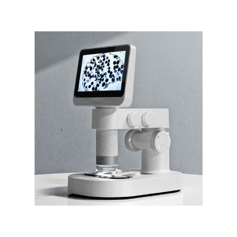 Microscopio digital portátil BeaverLAB DiProgress M2-A SMART, con visualización de imágenes en vivo desde su pantalla LCD de 4,3" y en dispositivos Android e iOS. Adecuado para la observación de minerales, insectos, plantas, electrónica con aumentos medios/bajos y también para la observación de diapositivas, tejidos, organismos acuáticos, gracias a la iluminación transmitida en la base. Ampliaciones de 100x a 1.600x.